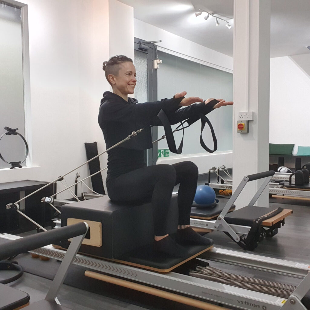One of the best things about the reformer is its versatility. Exercises can be done lying down, sitting, standing, pulling the straps, pushing the footbar, perched on the footbar, perched on the shoulder blocks, with additional equipment, upside down, sideways, and all kinds of variations.